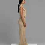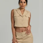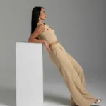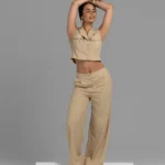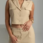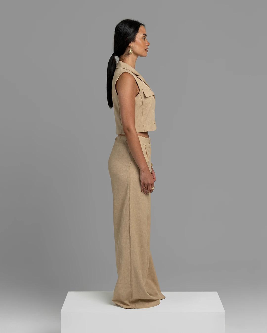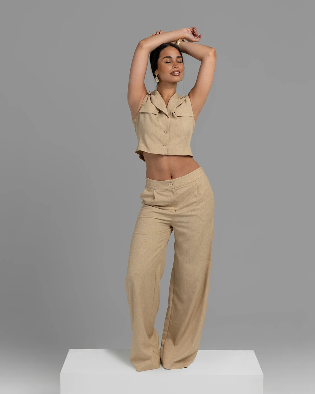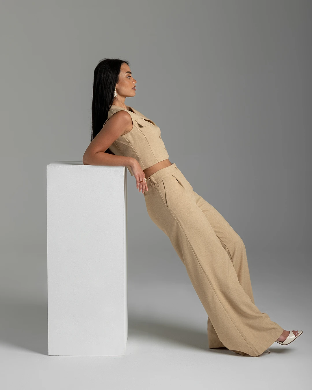 Moderan komplet u toploj bež nijansi, idealan je izbor za žene koje vole minimalistički, ali efektan stil. Strukirani kratki prsluk bez rukava, sa kragnom i kopčanjem na dugme u kombinaciji sa širokim pantalonama visokog struka.